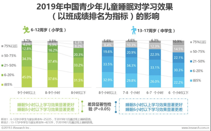 比如,2019年公布的《中国青少年儿童睡眠白皮书》中有一组数据就显示:睡够9小时的孩子,学习成绩进入前5%的概率是睡不足8小时孩子的3.5倍;而成绩垫底的风险则降低近3倍。